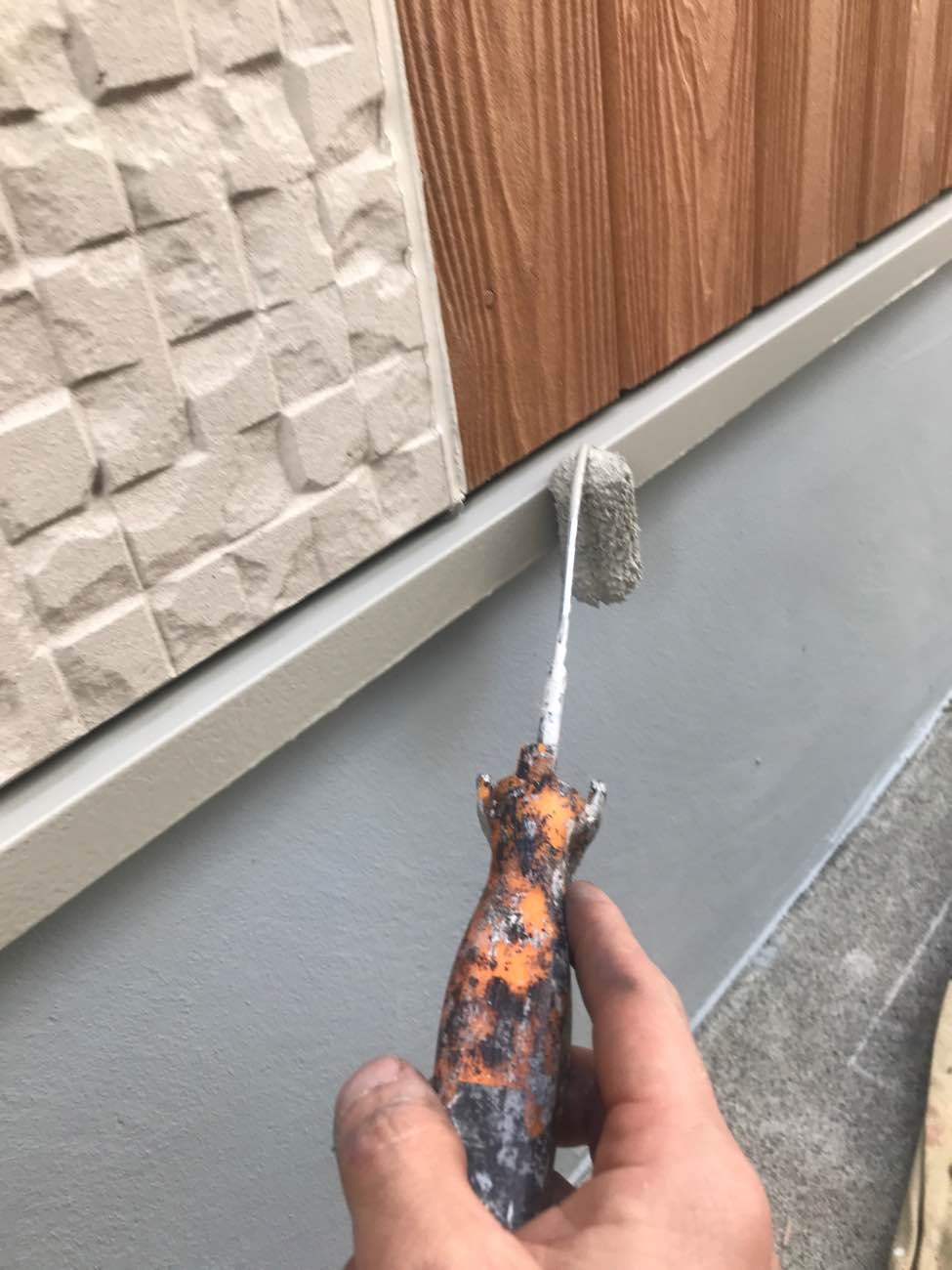 錆止めが乾燥したら、上塗り塗料の1回目を塗布。外壁色との調和を意識したカラーを選定し、ローラーと刷毛を併用して細部まで塗り残しがないよう仕上げます。