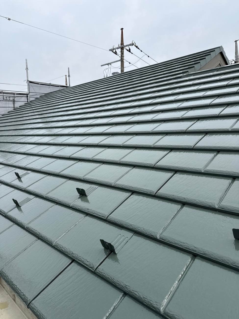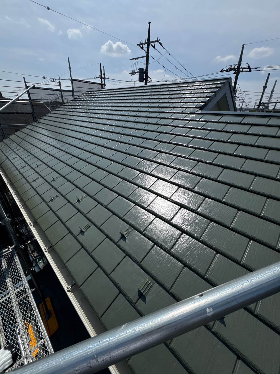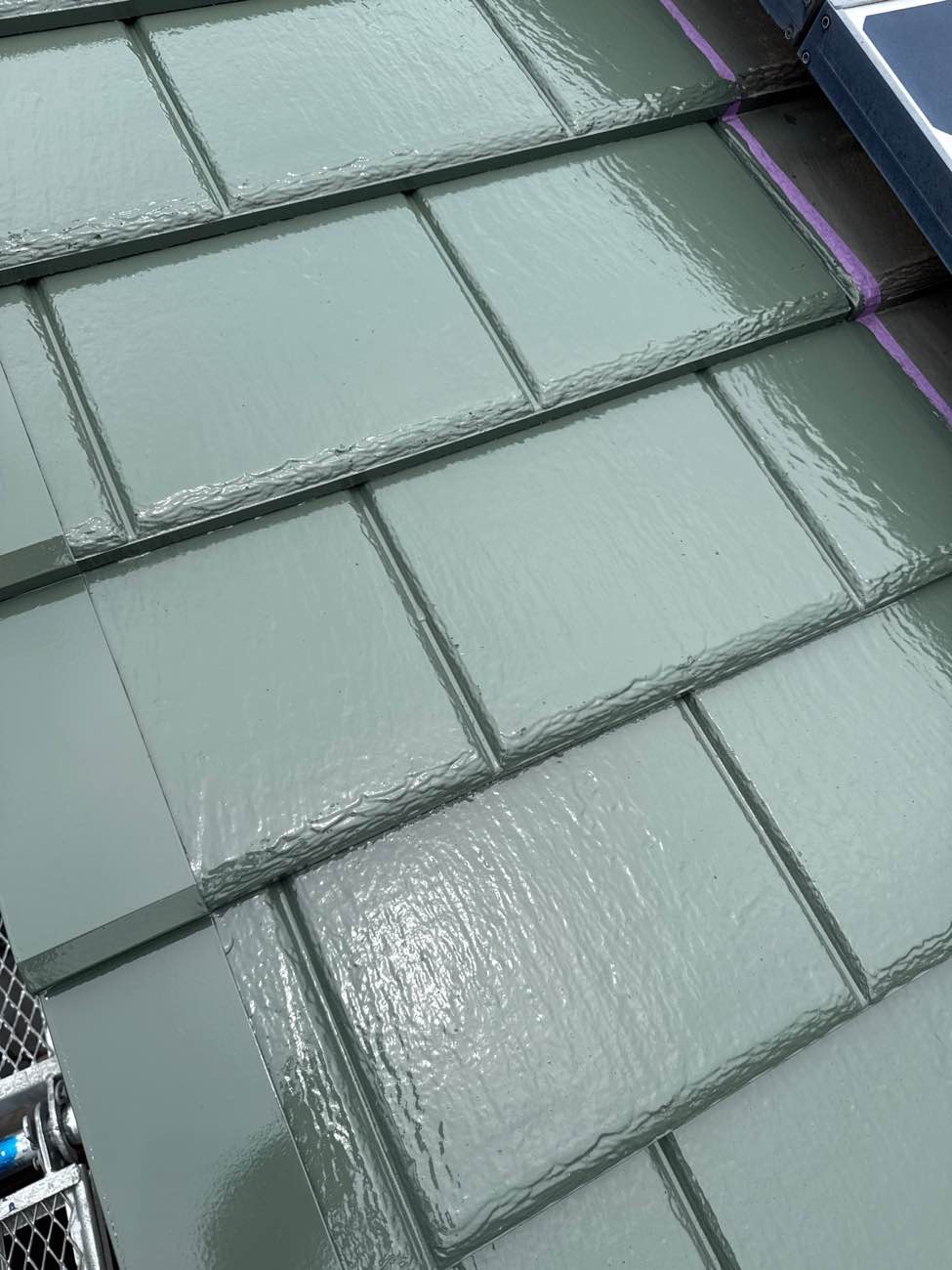 中塗り塗装完了後、屋根全体に均一な艶と色味が出そろいました。