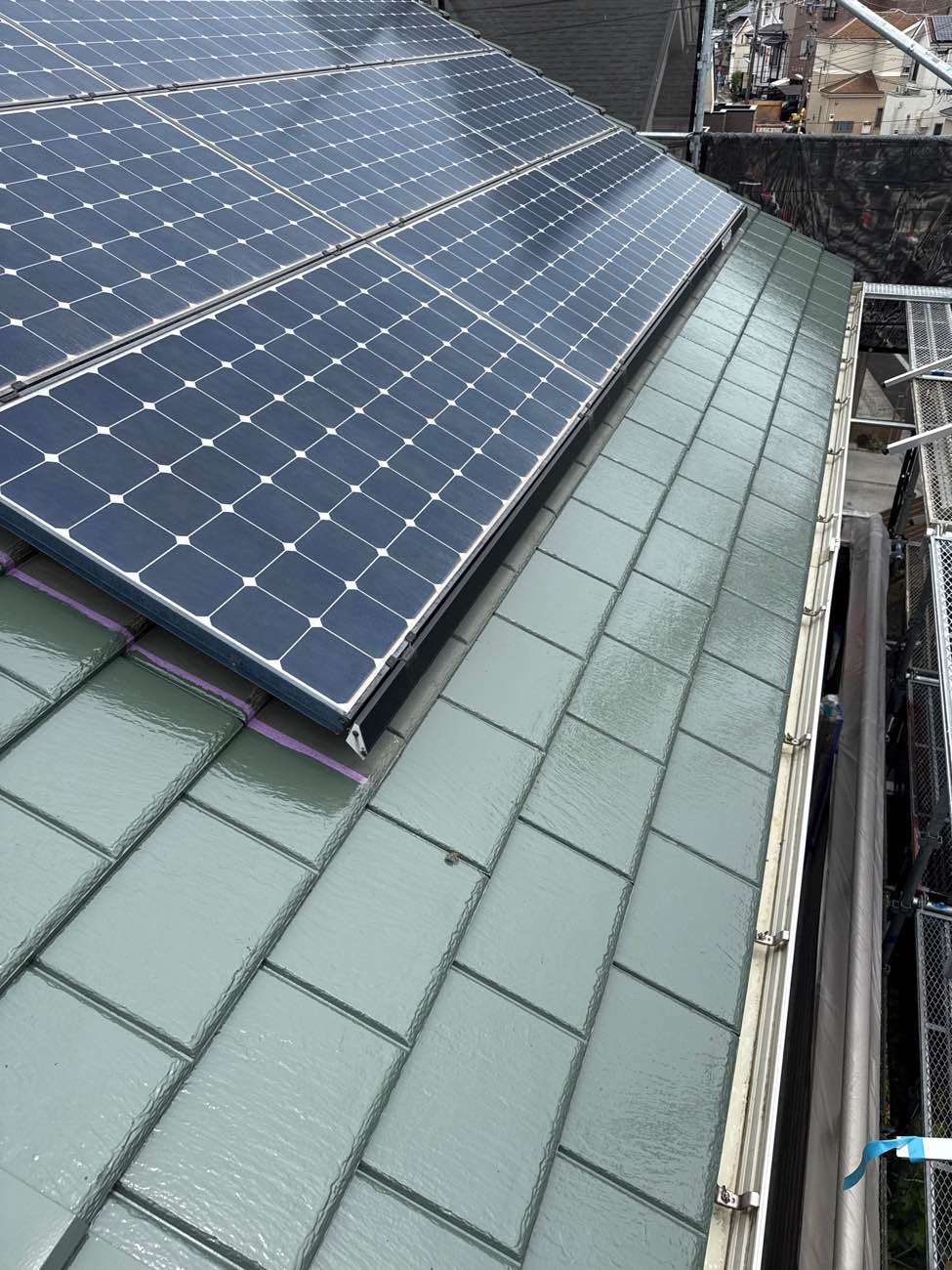 中塗り後は、スレートの重なり部や段差部分、太陽光パネル周辺など、塗り残しが出やすい箇所を重点的に確認します。
