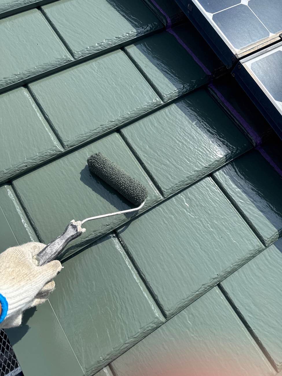 屋根上塗り塗装中の様子。スレート屋根にローラーで主材2回目を均一に塗布している施工風景