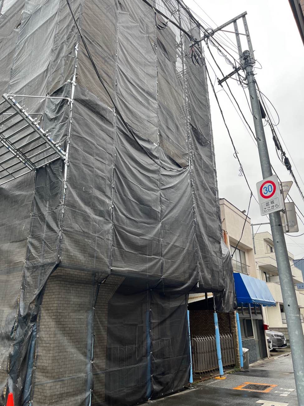 側面からの写真では、電線や隣接建物との距離を考慮しながら足場が組まれている様子が見て取れます。