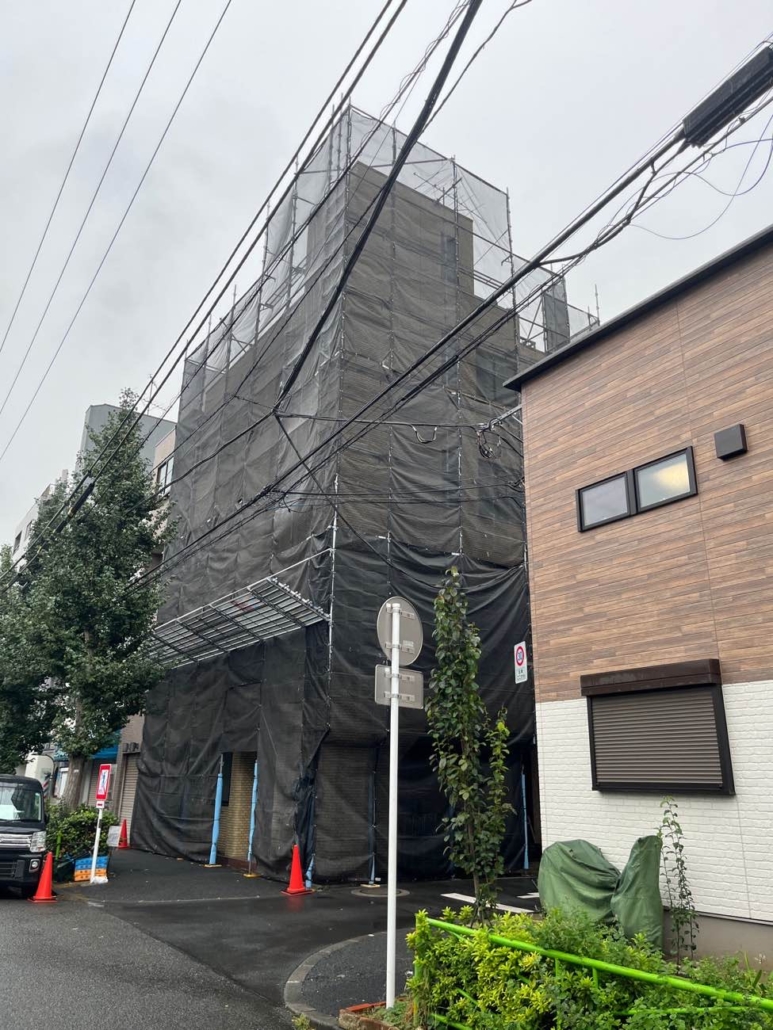施工中の写真では、建物全体を覆うように足場が組まれている様子が確認できます。