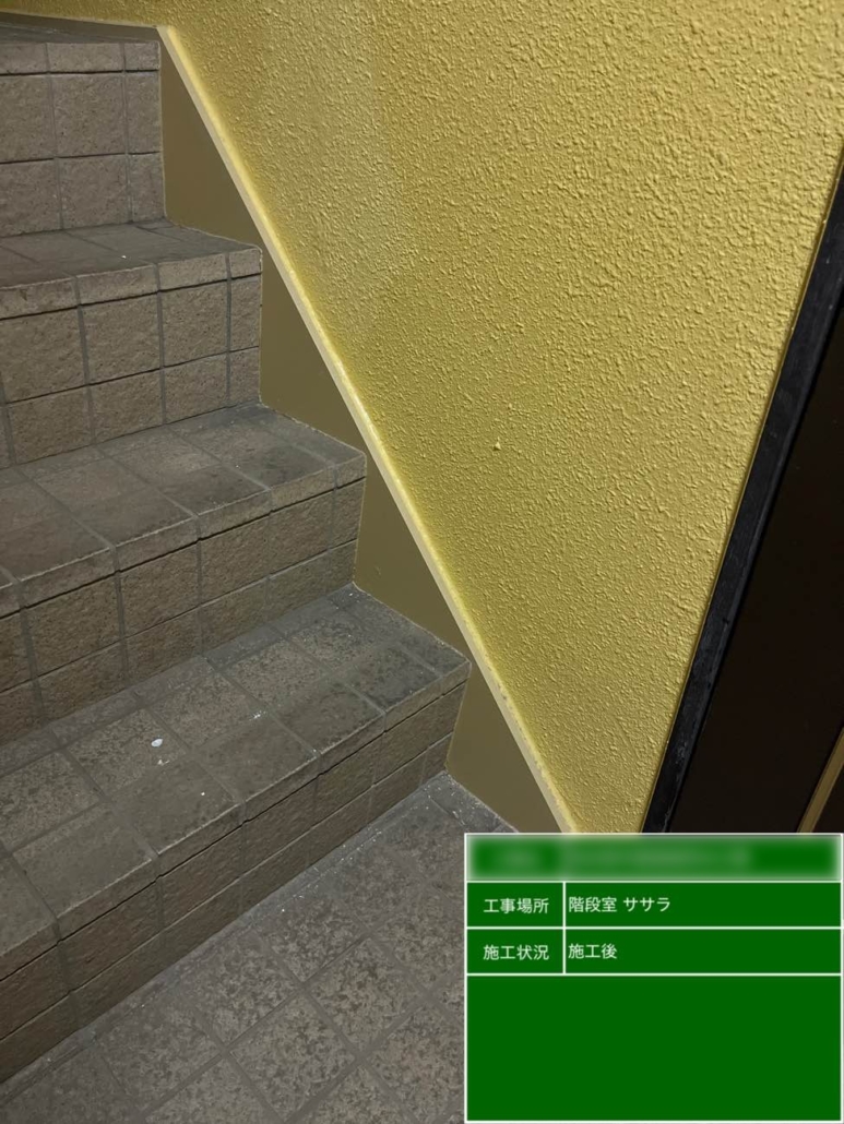 施工後の写真では、施工前に見られたサビや黒ずみが整い、階段室まわり全体がすっきりとした印象に仕上がっていることが分かります。