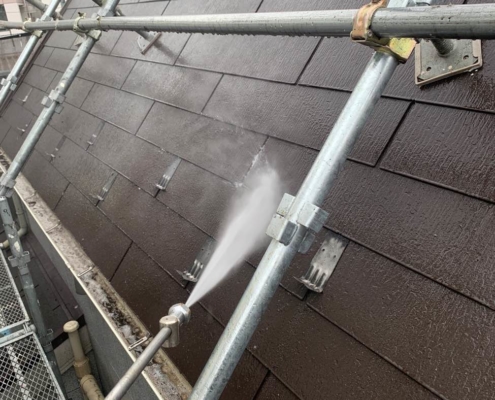 外壁・屋根の高圧洗浄で古い塗膜や汚れを徹底除去|葛飾区四ツ木のT様邸にて塗り替えリフォーム中