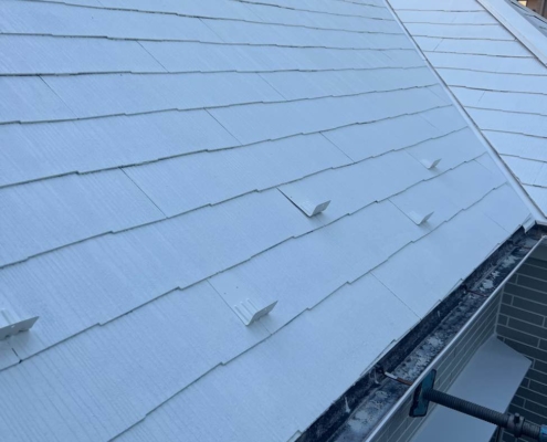 スレート屋根の上塗り塗装(主剤2回目の塗布)|足立区中川のF様邸にて塗り替えリフォーム中